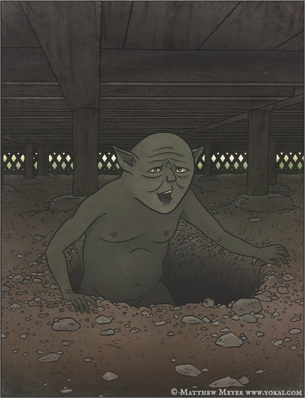 According to the japanese folklore, geya nyūdō are small, subterranean people who make their homes beneath human settlements. They are as small or smaller than human children, and almost always have a smile. Geya nyūdō live in old wells or in holes beneath peoples’ houses. When the home’s owners are away, they sneak into the house through the floorboards and eat the owner’s food, then sneak away before the owner returns.