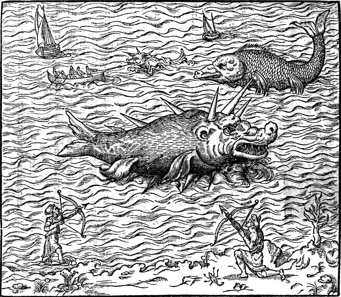 Paré economically combines both accounts, giving the caspilly a four-foot-long horn and making it the terror of the Arabian sea. He adds that the Arabs of the region hunt caspillys with giant hooks baited with camel meat. Any caspilly who greedily takes the bait will tire itself out on the line, eventually slowing down enough to be shot with arrows, brought onto ship, and bludgeoned to death. Caspilly flesh is edible, and caspilly alicorn is just as potent against venom as that of the unicorn.