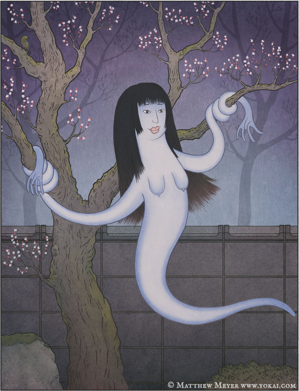 According to the japanese folklore, Honenashi onna is a ghost that haunts the area around Haba Mountain, Ushioe in Kōchi Prefecture. As the years passed, this ghost has taken on the appearance of a boneless woman. She looks like a typical Japanese ghost, with long black hair and a legless lower body that fades away as it trails off. Her nude body appears flabby and flexible due to having no bones, and she is able to coil her limbs around tree branches like a snake.