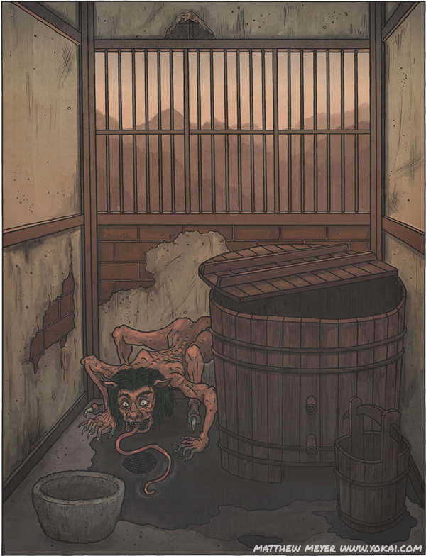 Аканамэ — небольшое, похожее на гоблина существо, которое живет только в грязных домах (а точнее — в заброшенных домах, а также в грязных ванных и туалетах) или общественных банях. Размером аканамэ с ребенка или невысокого взрослого, хотя выглядит значительно меньше из-за того, что постоянно сутулится. На голове у него копна длинных, сальных волос, да и всё тело скользкое от жира. Расцветки аканамэ довольно разнообразной: от тёмно-зелёного с пестринами цвета плесени, до красно-розового оттенка пролежней. Количество глаз и пальцев у него тоже варьируется — аканамэ может быть как одноглаз, так и с двумя глазами, а также с одним или пятью пальцами на руках и ногах. Однако, у всех аканамэ — независимо от числа глаз и пальцев, — есть длинный липкий язык, которым они слизывают слизь, жир, волосы и прочую гадость, которую находят в банях и туалетах.