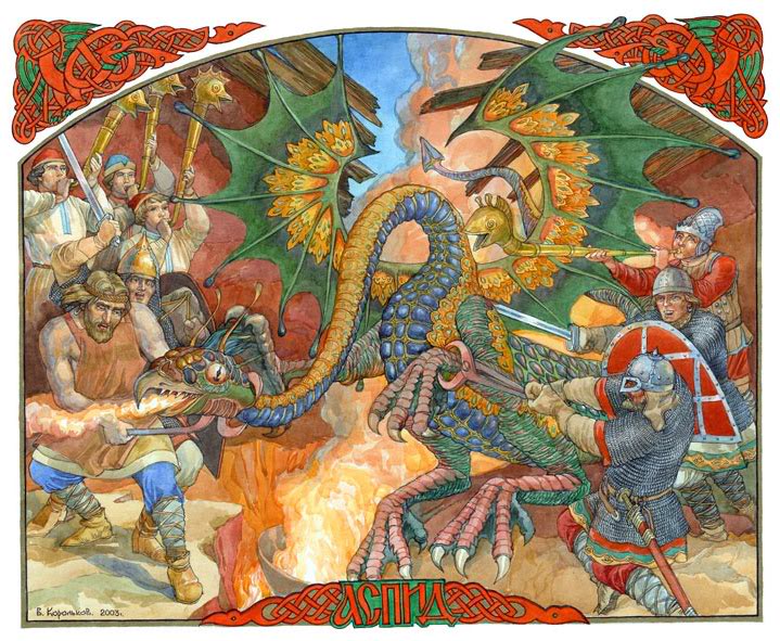 По славянской мифологии, а также в ряде средневековых европейских бестиариев, аспид — это "крылатая змея, которая нос имеет птичий и два хобота. В какие края летать повадится, те места опустошит; живет в горах и на землю никогда не садится, только на камень. Его невозможно убить стрелою, можно только сжечь" (8).