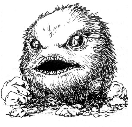 "To, co jeszcze przed chwilą brał za leżące u podnóży stalagmitów okrągłe głazy, teraz wybałuszało na niego wielkie, jarzące się ślepia. W zbitej masie szaroburych, pokrytych kurzem kudłów otwierały się ogromne paszczęki i błyskały stożkowate kły.