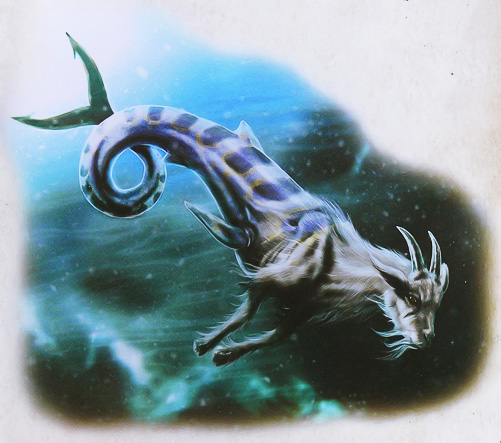Десятый знак зодиака. Изображался в виде однорогого (средневековая традиция) козла с рыбьим хвостом. "Его двойственная природа, аллегорически выраженная в виде козы, чье тело оканчивается рыбьим хвостом, намекает на дуалистические тенденции жизни, с одной стороны, к бездне (или водной пучине), и с другой стороны, к высотам (или горам). В индуизме эти два течения означают также инволюционные и эволюционные возможности: возвращение или выход из "колеса перерождения" (т.е. Зодиака)." (26)