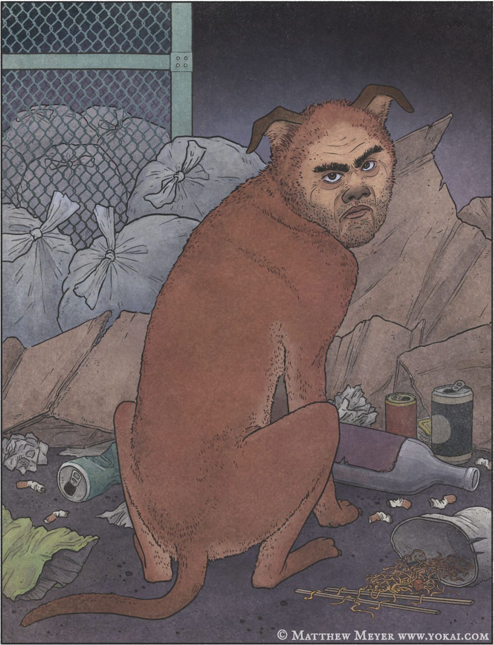 According to Japanese urban legends, jinmenken are dogs with human-like faces — most commonly the faces of old men. They are found wherever dogs can be found, especially at night near parks and graveyards. Some of them have faces that resemble monkeys more than humans, while others are very human-like, with front hands instead of paws.