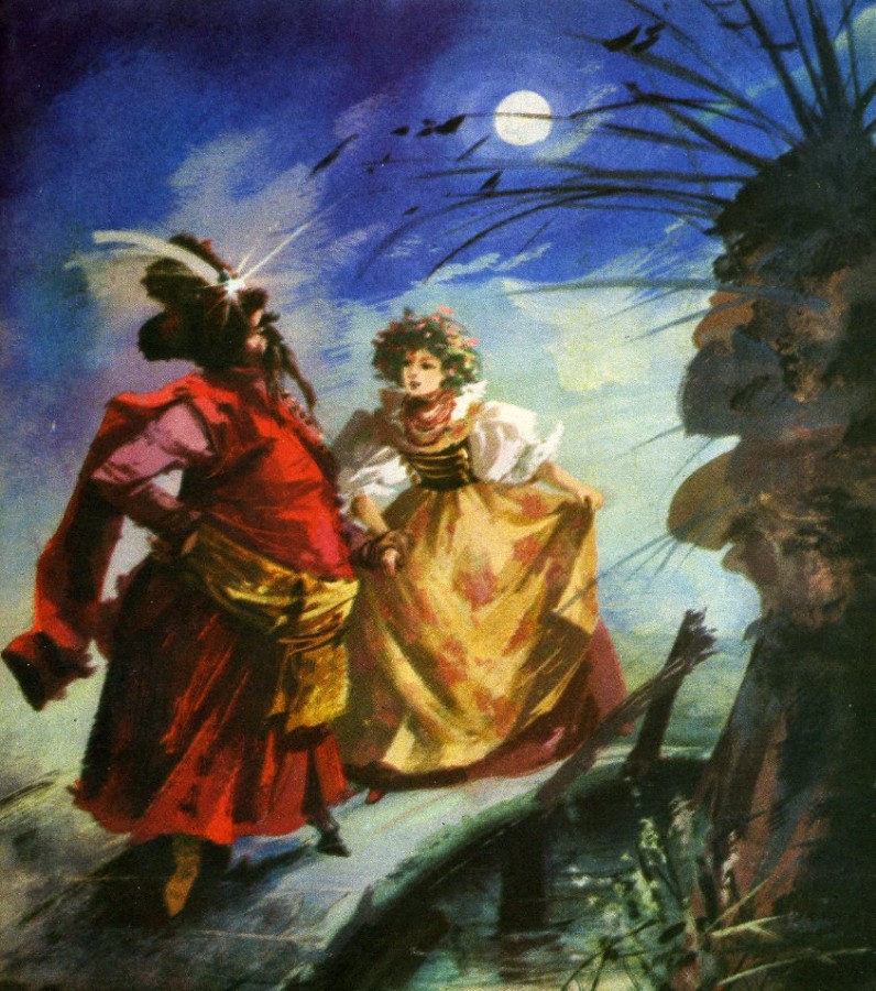 И заметила Кася в серебристом сиянии луны жупан его красный, золототканным поясом перетянутый. На соболиной его шапке с перьями, словно звезда яркая, большой алмазный аграф сверкал. Низко склонился он перед Касей и молвил: