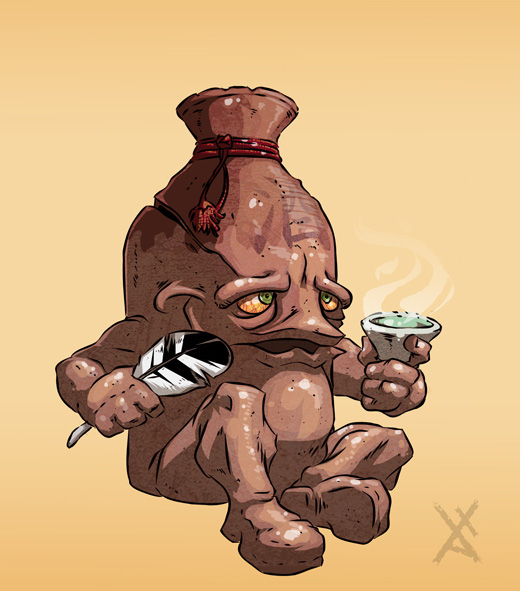 Камэоса, как всем хорошо известно, представляет собой столетнюю бутылку из-под сакэ, которая стала цукумогами. Преобретши сей волшебный статус, бутылка словно бы очеловечивается: трещины на ней складываются в алкогольно-умильную физиономию, появляются испорченные артритом руки, из дна вырастают мосластые и зело волосатые ноги. Руки у камэоса, впрочем, тоже далеко не голые. В общем, гоблинские такие конечности. Однако несмотря на такую далеко не благородную внешность, камэоса заслуженно считается одним из самых благоприятных для человека цукумогами. Благоприятность же эта состоит в том, что пока бутылка "оставалась ненужной столько лет, пропитываясь магией небес и земли, она самопроизвольно начинает вырабатывать рисовое вино, воду или любую другую жидкость, которую в нее наливают" (*).