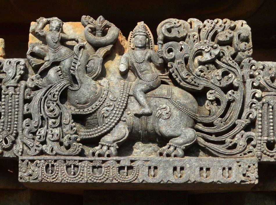 В индуизме статус макар повышается и они становятся ваханами важнейших богов: Варуны*, Сомы*, Камы* и Ганги* (образ характерен для искусства эпохи Гуптов, в частности, он встречается в декоре портальных колонн храма в Каджурахо (*)). Кроме того, макара входит в число сокровищ Куберы*, символика макары присутствует в обрядах, связанных с Индрой*. Если обратите внимание, то во многих образцах индуистской иконографии многие божества носят в ушах серьги в форме макар, что символизирует два вида познания — интеллектуальное и интуитивное. В современных вариациях индуизма макару часто связывают со второй чакрой в человеческом теле, свадхистаной, находящейся в области гениталий (**).