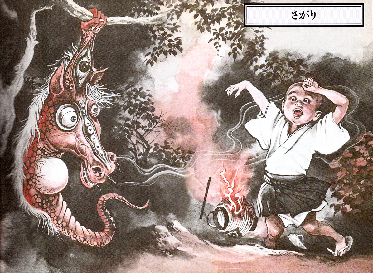 Сагари рождается, когда под деревом (как правило, речь идет о дереве хурмы!) умирает от болезни лошадь, и дух ее сливается с деревом. Конская голова без тела свисает с ветки, держась за нее либо схожей с побегами растений гривой, либо цепкой шеей-хвостом, либо единственной рукой, начинающейся от локтя и заканчивающейся кулаком. Ко всему прочему оно еще и жутко воет по ночам, а увидевший это ужасное зрелище воочию обречен подхватить страшную болезнь (как минимум, лихорадку), но при всем этом сагари не агрессивны.