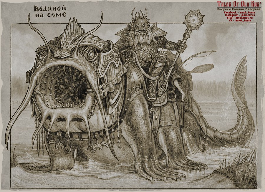 "В славянской мифологии злой дух, воплощение стихий воды как отрицательного и опасного начала. Чаще всего выступает в облике мужчины с отдельными чертами животного (лапы вместе рук, рога на голове) или безобразного старика, опутанного тиной, с большой бородой и зелёными усами.